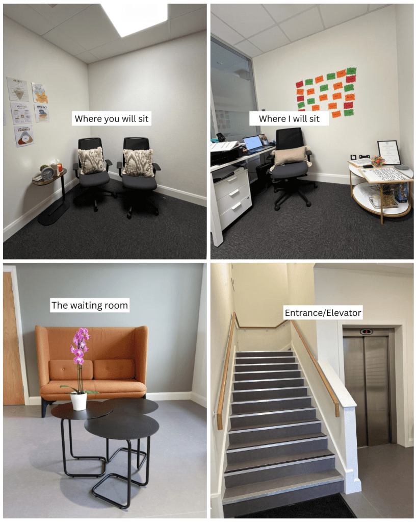 Because of this, I like to give clients a clear idea of what the first session will feel like. Sometimes, simply seeing the space beforehand helps. Looking at photos of the therapy room — and knowing what I look like — can make it feel less daunting. You can view these for yourself, or share them with your adolescent, so they know what to expect too.